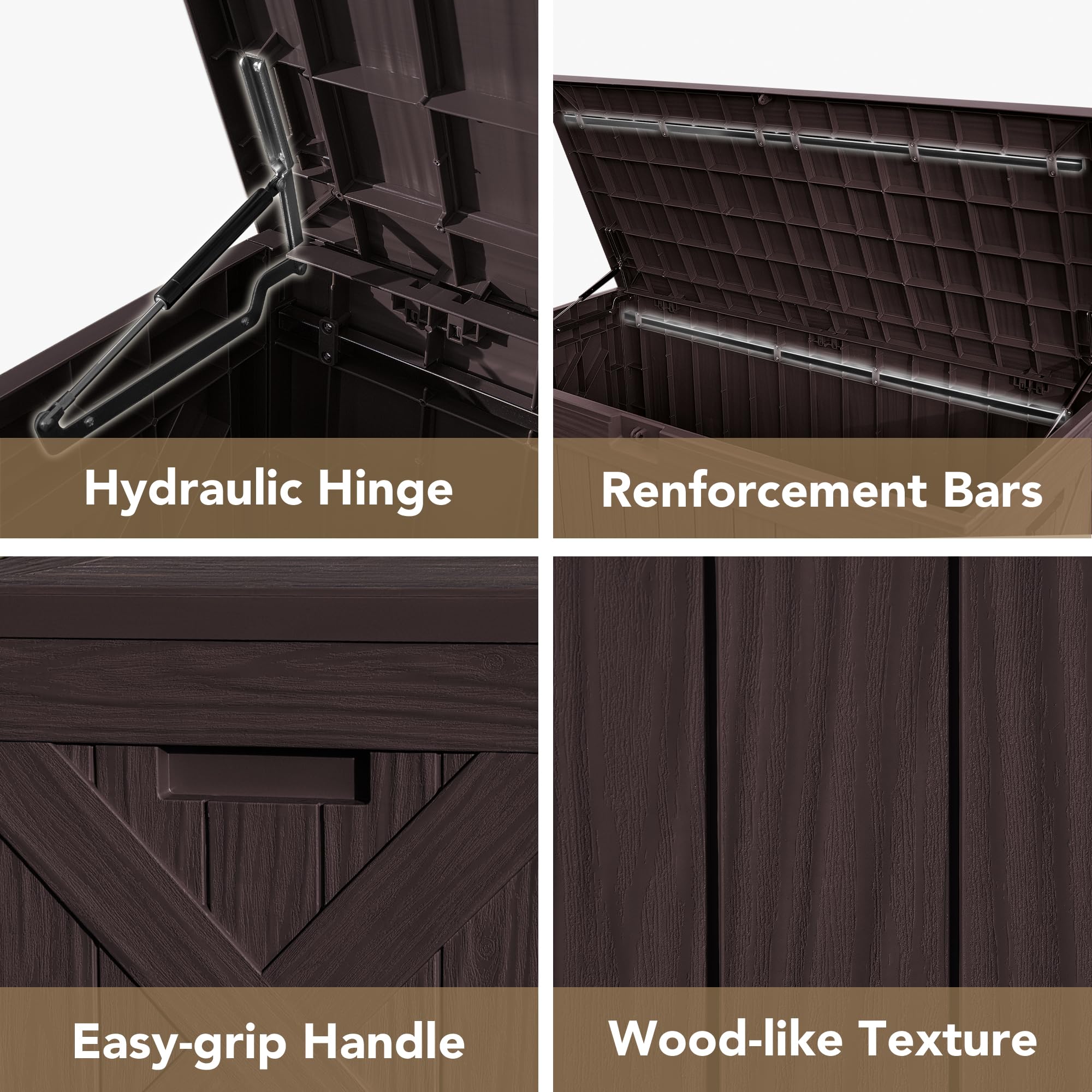 2.High-quality Resin: The deck storage box is made of water-resistant resin, complemented by a wood like grain design that maintains a fresh look even with all-weather use